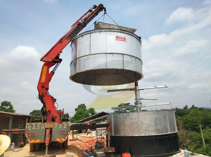 發(fā)酵罐主要由發(fā)酵室、液壓動力系統(tǒng)、主軸傳動系統(tǒng)、上料提升系統(tǒng)、自動高壓松風系統(tǒng)、出料系統(tǒng)、除理臭味系統(tǒng)和自動控制系統(tǒng)組成,工作時,先由上料提升系統(tǒng)將物料送到發(fā)酵室,開啟液壓動力系統(tǒng),主軸開始轉動,實現(xiàn)物料攪拌,同時,開啟送風系統(tǒng)和輔助加熱系統(tǒng),維持微生物發(fā)酵條件。等物料在微生物菌劑的作用下腐熟、降解穩(wěn)定后,通過液壓動力系統(tǒng)開啟落料閥門,利用皮帶輸送機將發(fā)酵后的物料,發(fā)酵后排出的氣體通過系統(tǒng)收集處理達標后排除。